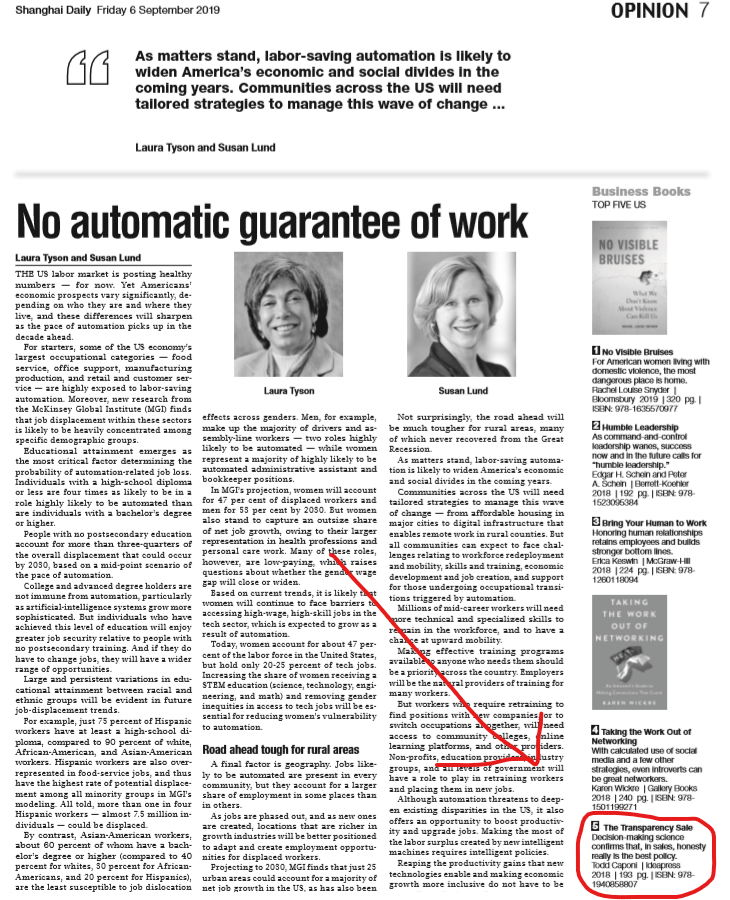 I am soooo pleased and humbled to announce that The Transparency Sale is now an international best-seller. In last Friday’s Shanghai Daily, the book showed up in 5th place on their Business Books best-seller list.
