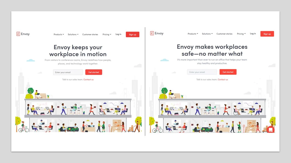 This is a San Francisco based company called Envoy. The picture on the left is of Envoy.com back in February. The picture on the right is today. Notice, even the cartoon picture at the bottom has people wearing masks now. When you scroll down on their site, you’ll see links to how they help in this current environment.