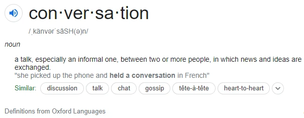 In the English dictionary, the definition of “conversation” doesn’t quite cover it…